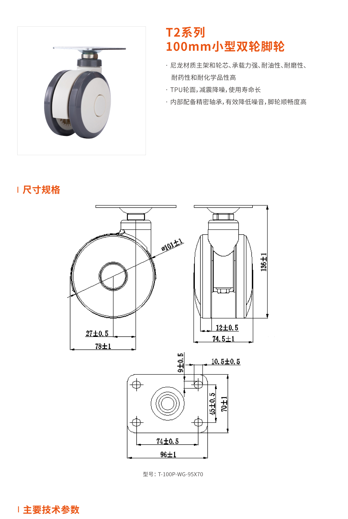 T2系列 100mm小型双轮脚轮